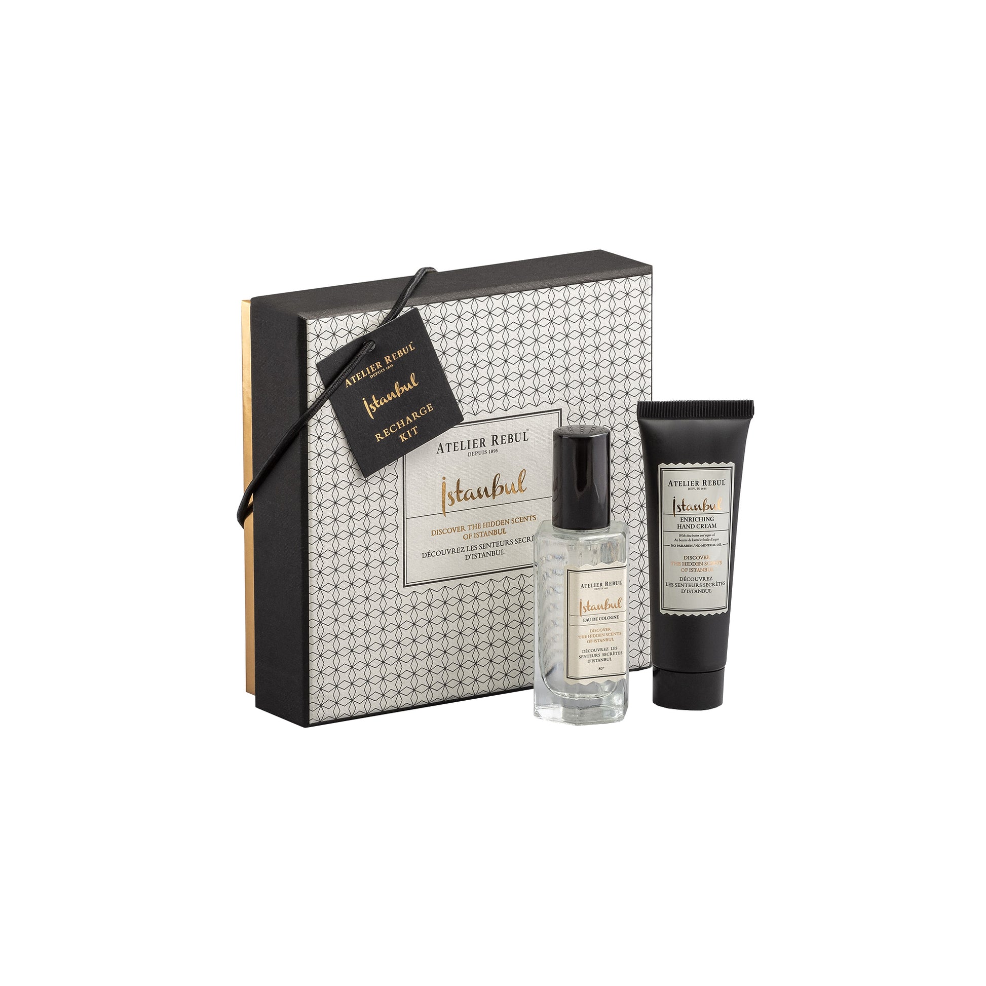 Atelier Rebul`s new Istanbul Recharge Kit will be a great gift alternative for you and your loved ones, consisting of hidden scents of Istanbul. A mysterious and attractive cologne is added to the unique cologne collection created by Atelier Rebul over the years: Istanbul Eau de Cologne. The scent opens with the glittering notes of bergamot, unveiling a glamorous and magical World with the luxurious and warm spicy notes of cinnamon, saffron, and clove.<br /> The seducing flower scents at the heart notes are blended with violet, jasmine, and black orchid.<br /> Finally, the base notes of vanilla, amber, musk, cedar, patchouli, and sandalwood meet the charming oud tree to leave a permanent mark.<br /> On the other hand, Istanbul Hand Cream, enriched with Shea Butter, and Almond Oil, that instantly penetrate the skin to protect, nourish and hydrate the hands with a silky feel. Argan oil rich in linoleic acid, and natural tocopherols (Vitamin E) help to soften, strengthen and protect your hands from aggressive external factors, renews it, reduces wrinkles and tightens the skin.